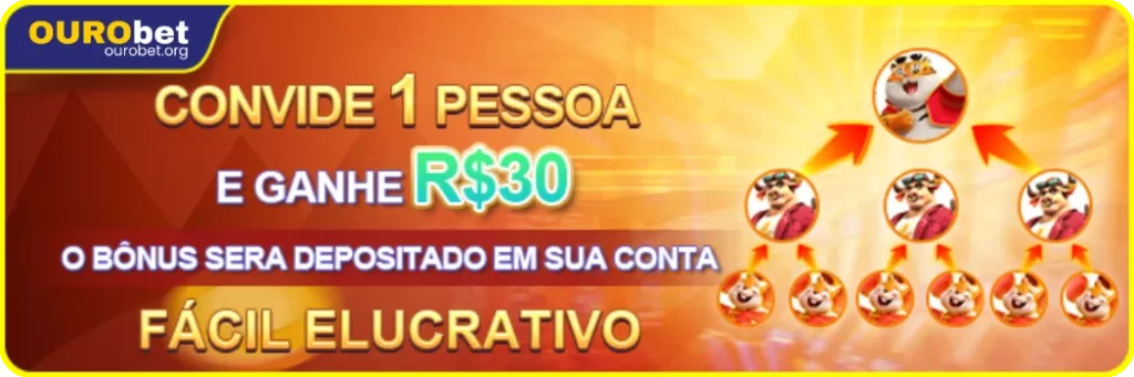 Ao convidar 1 pessoa para se cadastrar na OUROBET, você ganha R$30 diretamente na sua conta. O bônus é creditado automaticamente após a indicação válida, sem complicações. É uma promoção fácil e lucrativa, ideal para quem quer aumentar o saldo apenas compartilhando a plataforma com amigos.