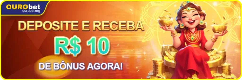 Quem fizer um depósito na plataforma Ourobet pode ganhar um bônus instantâneo de R$ 10. Essa é uma excelente oportunidade para começar a jogar com um bônus extra! A imagem com a figura de uma deusa sorridente simboliza a prosperidade que pode vir com esse bônus de boas-vindas.